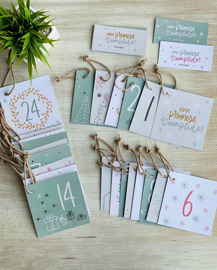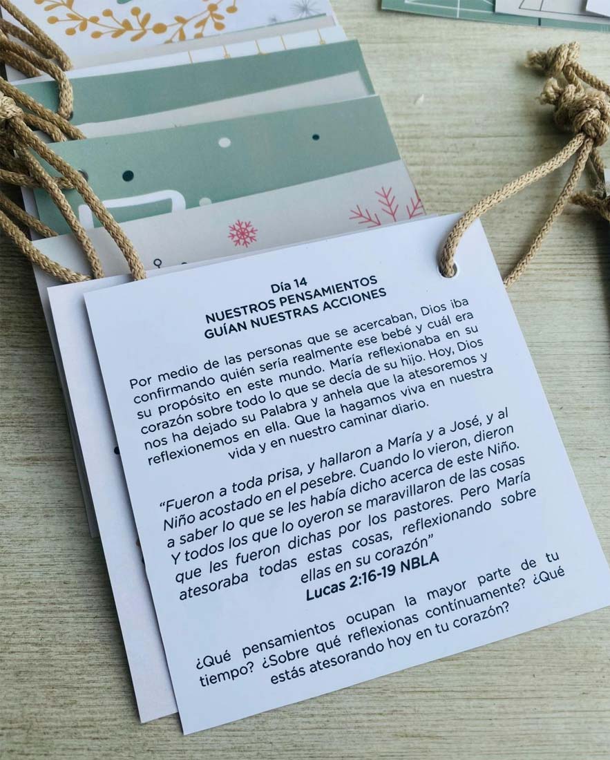 Viene con 25 tarjetas de 10 × 10 cm, con una reflexión para cada día. Adicional 15 tarjetas de actividades para hacer en familia, empacado en bolsa de lienzo.